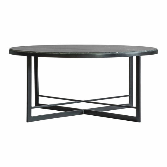 The Necton Coffee Table makes a stunning addition to a room. The black Indian marble top, with its white and grey veining, pairs beautifully with the matted black metal base, for a sophisticated apartment living look.