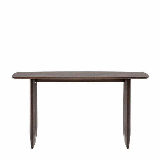 Make a style statement with this bold and beautiful 70s influenced console table. Perfect as either a slim desk or a console table, the dark stained Mango wood is full of rich grains while the eye caching carved U shaped legs add the final touch of retro cool. Coordinating further pieces also available.