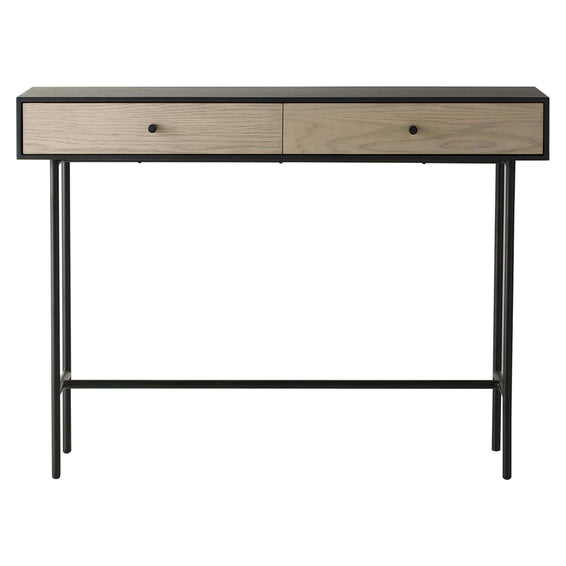 Stylish collection of Oak Veneer furniture, perfect for adding the finishing touch to your living space. Featuring a black Oak veneer body and white Oak veneer drawers and shelves, this collection is finished with black metal legs and handles.