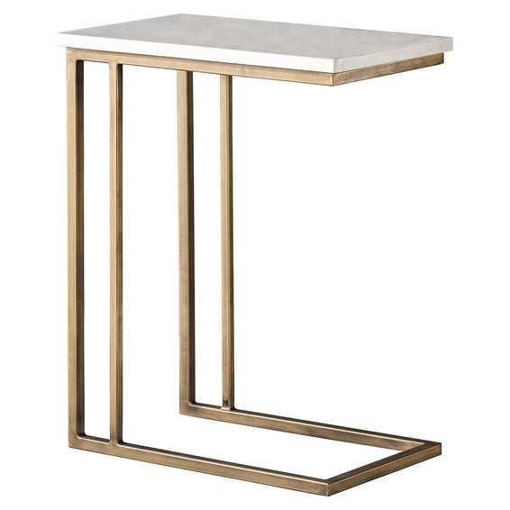 A contemporary supper / sofa table featuring Spanish volkas marble in white with grey vein detailing in the grain and a brushed bronze angled metal base. This neo classical style will suit a multitude of interiors designed as a side sofa table or a TV supper table.