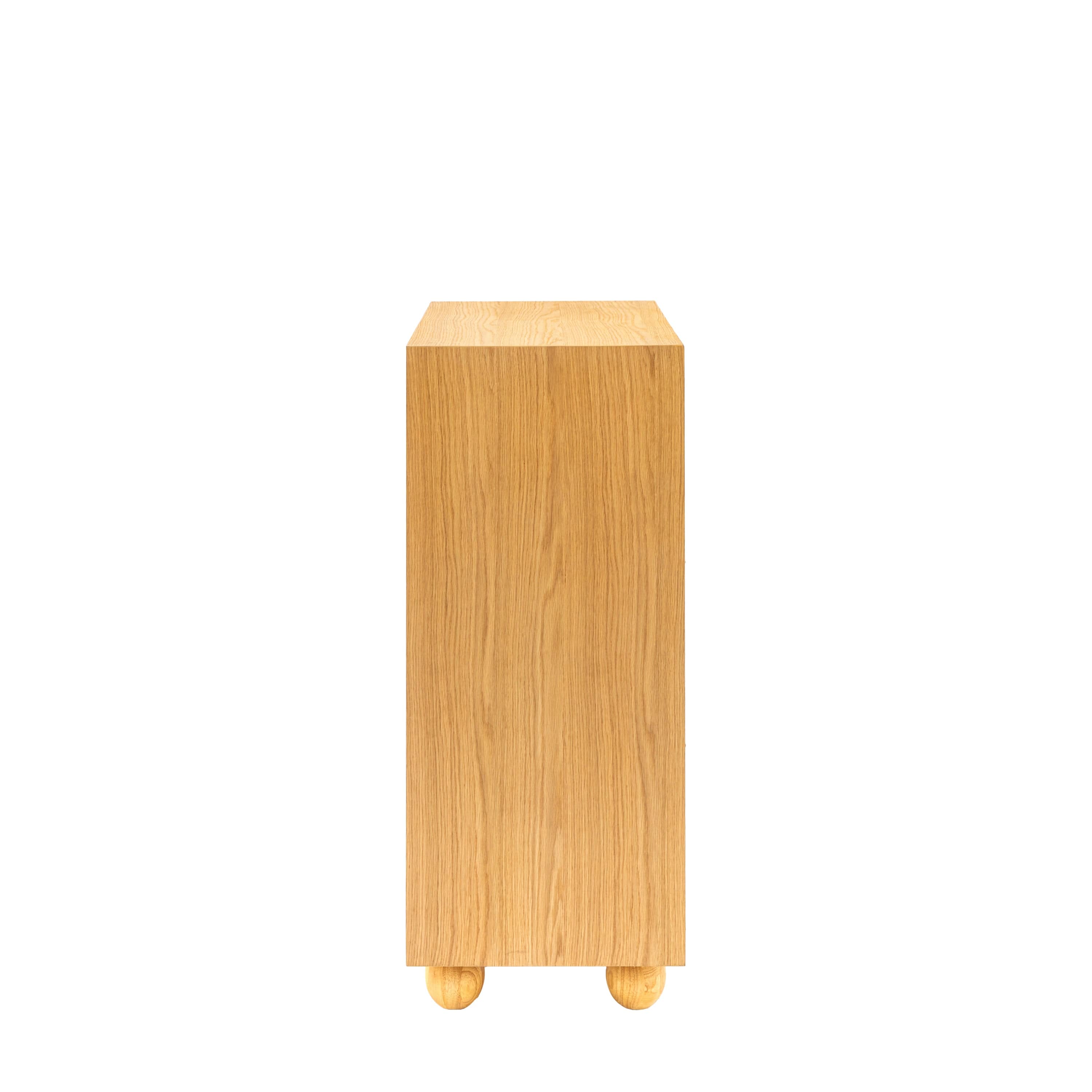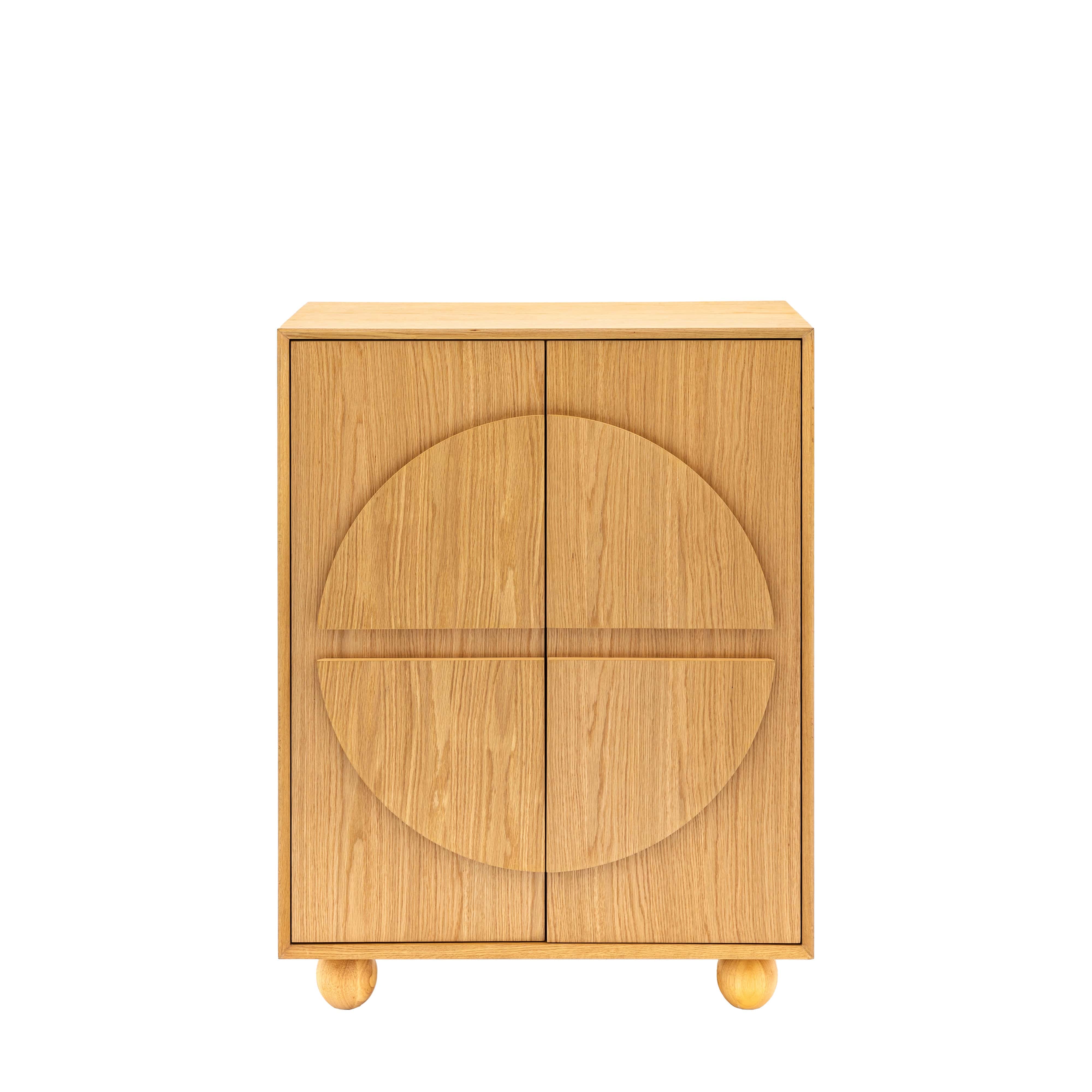 Designed to highlight the use of geometric design, with a nod towards a retro feel but in a more modern format, this stunning Geo sideboard combines style and practicality. It features beautiful circular shaping on the doors, with spherical feet echoing this. It is made using oak veneers and solids, where practical, with a natural matt finish. Matching pieces are available.