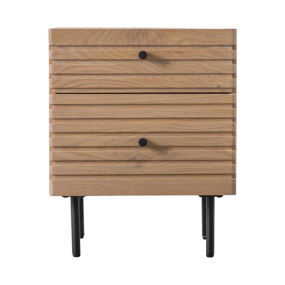 The Okayama 2 Drawer Bedside features solid oak drawer fronts which are beautifully routed to echo the slats on the bedsteads and other pieces in the collection. Radius detailing up the edges of the drawer fronts adds a classy high-quality finish. Slim black metal legs and matching handles complete the look.