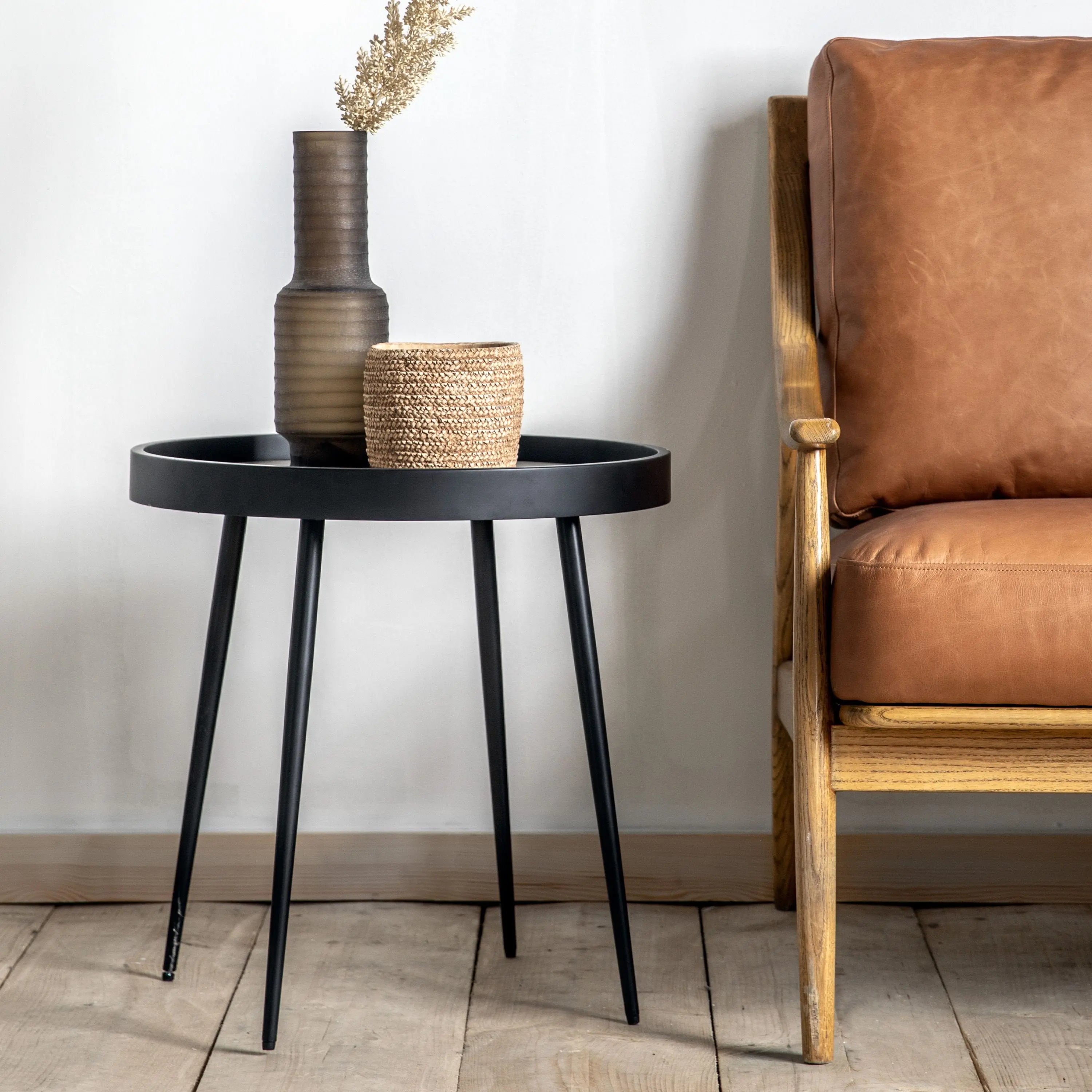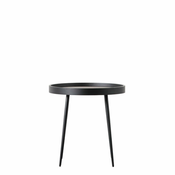 Side table offering a contemporary twist on an industrial look. The legs and frame around the table top are crafted from black metal, whilst the inset top is faux timber. A matching coffee table is available.