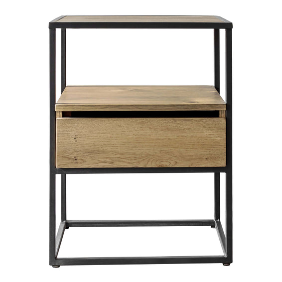 This space conscious solid Oak side table is ideal for the bedroom or lounge; this table has a useful drawer with a cast metal handle. The smoked oak version is made from solid Acacia wood with a slate grey painted base and a smoked Oak veneer table top.