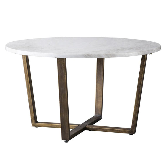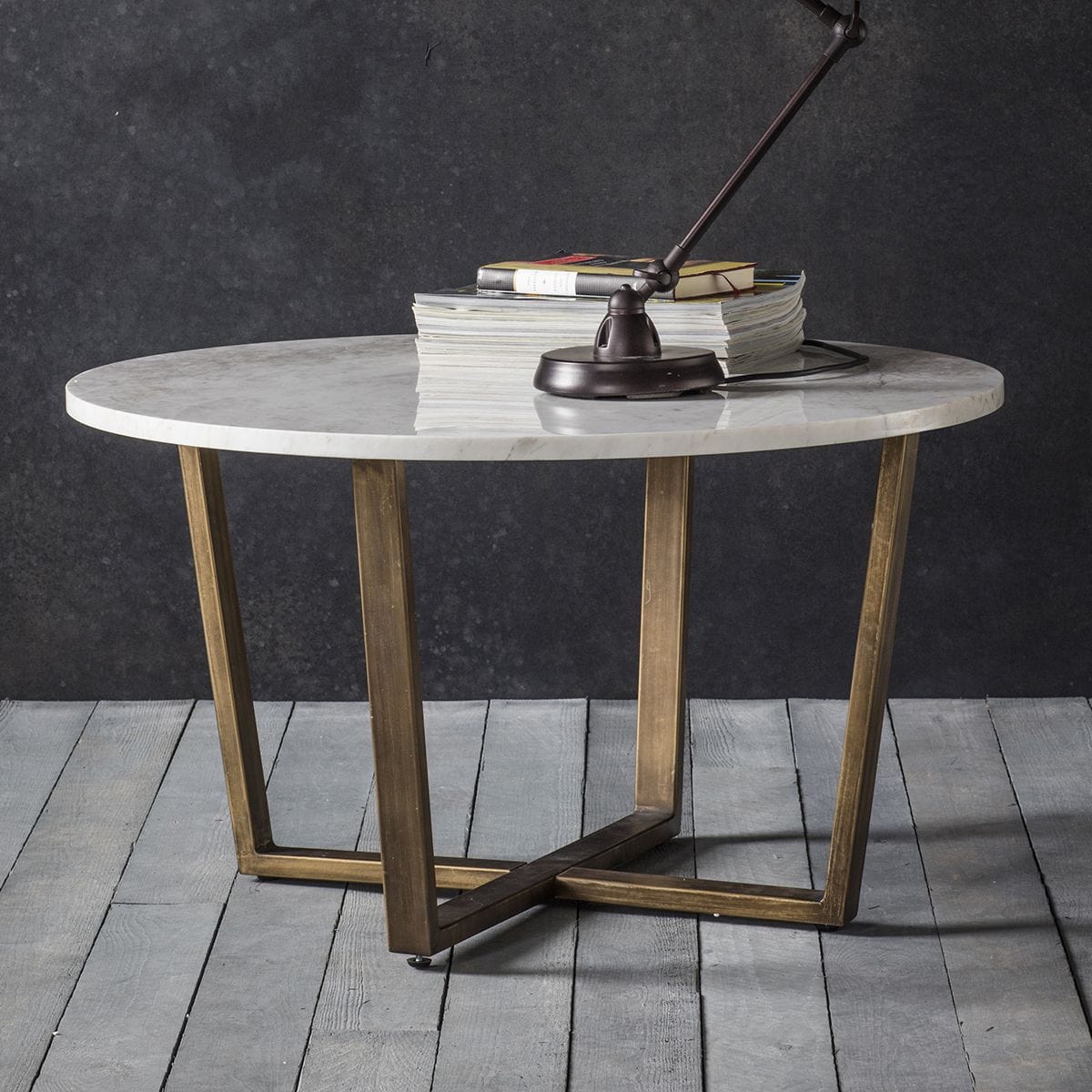 A contemporary round coffee table with a white volkas marble top featuring subtle natural tones in the grain and a brushed bronze angled metal base.