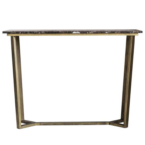 A contemporary console table featuring a rich brown Spanish Emperor marble top with distinctive yet subtle natural brown and white tones in the grain and a brushed bronze angled metal base. This neo classical style will suit a multitude of interiors.