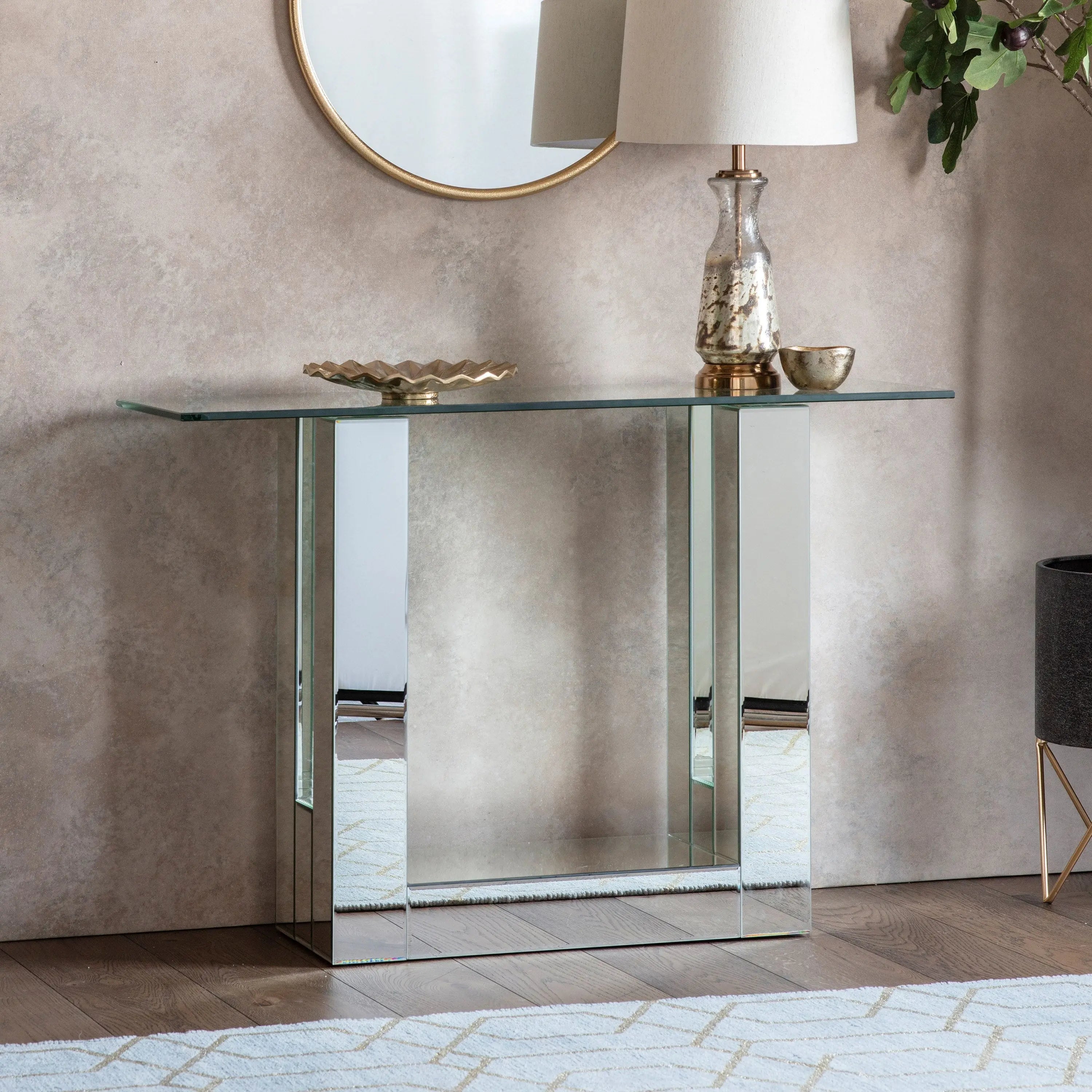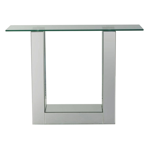 Ultra modern console table perfect for adding the finishing touch to your living space. With a bevelled glass top and sleek silver finished base this table looks at home in any contemporary decor.