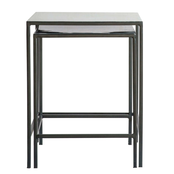 The Mellieha Nest of two tables feature slim square black metal frames and 'floated-on' enamel tops. With a stylish contemporary feel, they are perfect for a chic apartment living look. matching coffee and console tables are available in both a dark and light grey finish.