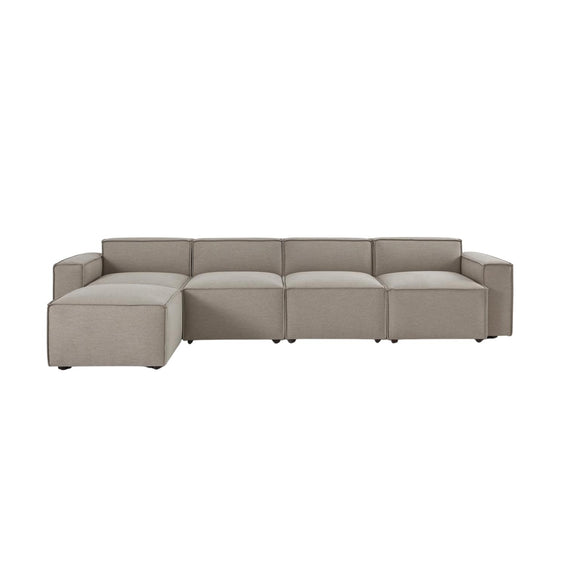 Your living room is your playground, so you make the rules. Whether it's two seats or ten, left or right corner, with or without an ottoman, you can build a sofa that suits your lifestyle. The 4-seater sofa comprises one left module, a right module, and two single modules—an ideal setup for those with a full house. The modules stay together with interlocking clips on the base of each module, with solid wood feet and plastic glides to keep your sofa firmly in place.