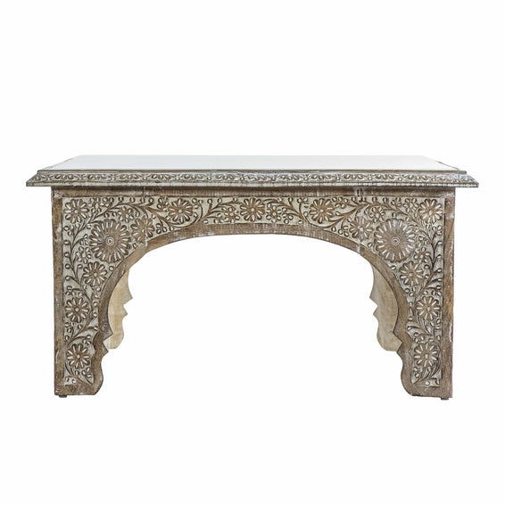 The Mumbai Coffee Table features blind fretwork which is hand-carved to create a beautiful intricate design, and the washed finish highlights the detailing. For practicality, the top is protected with bevelled glass. A matching side table is available.